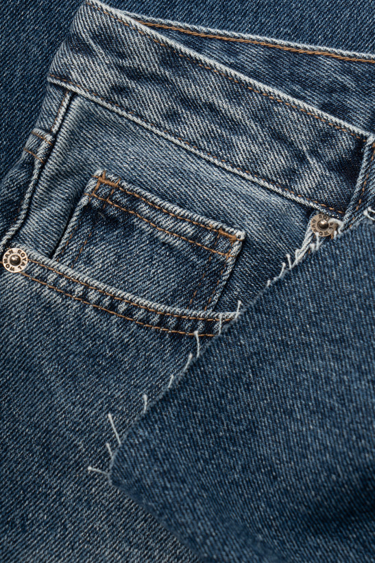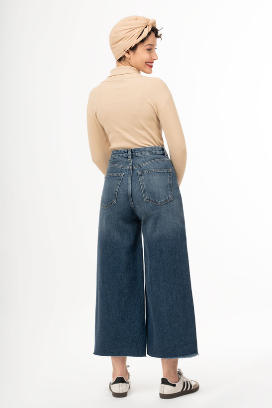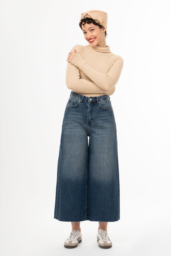 شلوار جین لانگ واید لگ کراپ (Long Wide Leg Crop) کمر ساده بدون زاپ - قد 90 - آبی تیره برفکی